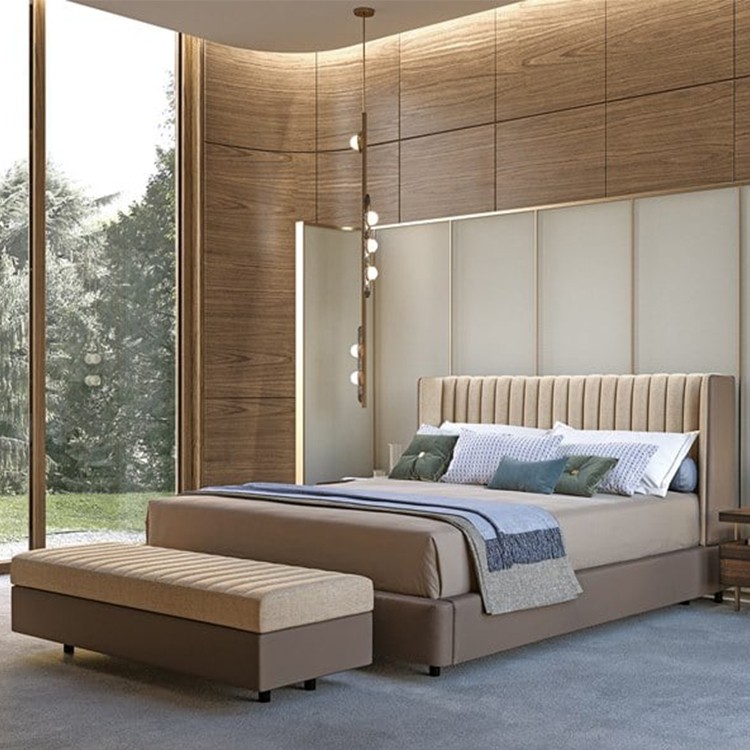 皮質軟包床頭板搭配柳釘金屬鑲嵌,既有簡潔自然的外形,也有繁復精巧的工藝,在注重線條流暢明快的同時,還講究不同材質之間的搭配。
