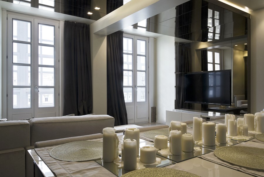 正因公寓正面優(yōu)美線條沿續(xù)著加利西亞傳統(tǒng)建筑當(dāng)中非常典型的畫廊元素,地坪組合拼貼則由花崗巖石和實(shí)木交織交會,尤其是木地板展現(xiàn),受到更多細(xì)緻歷史痕跡的恢復(fù),天花鏡面的壁面垂直延展,大量室內(nèi)物件與人員移動如同水中倒影般活絡(luò)出最真實(shí)的生活倒影。