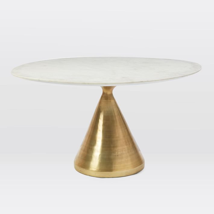 我們的剪影臺座餐桌與豐富多彩的大理石頂部坐落在戲劇性的金屬基礎上,是一個不錯的形象。底座解放了腿部空間,使它更容易拉一或兩個額外的椅子。