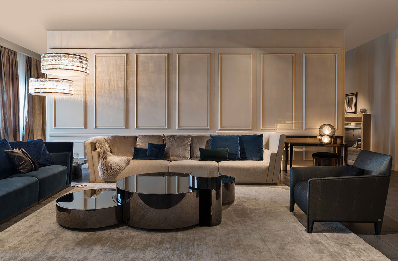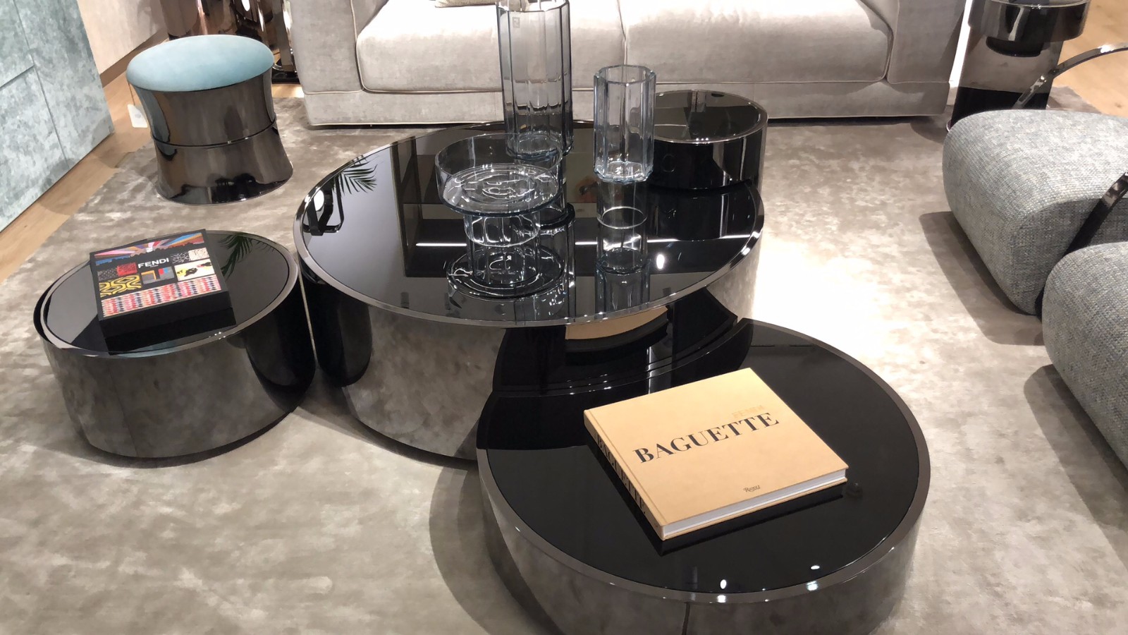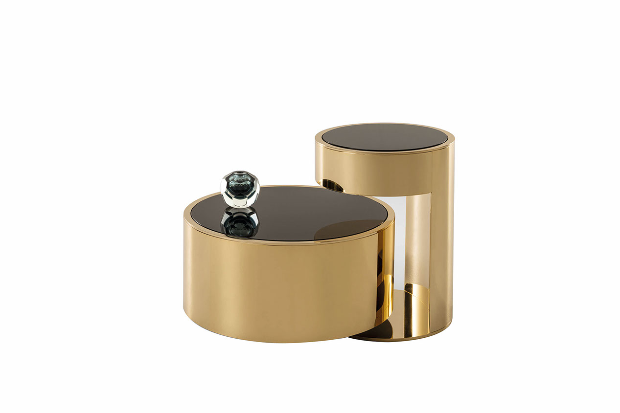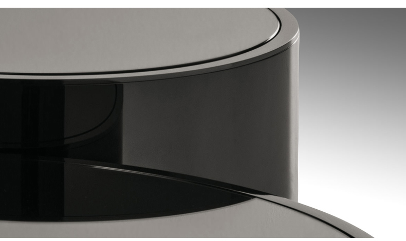 Constellation is the elegant circular coffee table set with minimal lines and a retrò look. The marriage of volumes and proportions come together defining an idea with sculptural contours. The extra-light, smoky or bronze mirrored top, matching the structure also can be made in the shades of Prussian Blue, garnet red or black.
