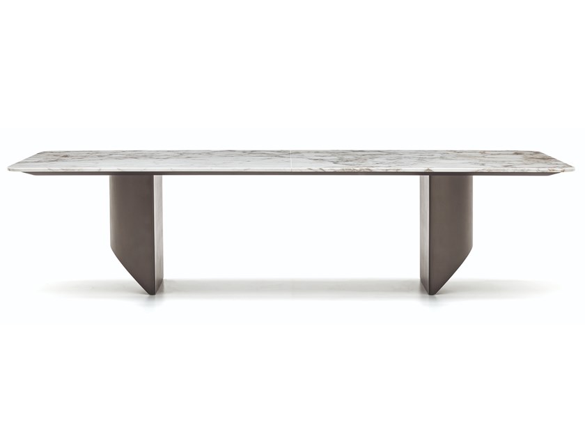 The bulky look created by the solid sculptural masses of the semi-circular legs of Wedge contrasts with the lightweight feet, which culminate in an oblique chisel tip shape.? The entire volume of the table, hosting the large top, appears to become weightless and leans lightly on the tips of the legs, challenging the law of gravity.?