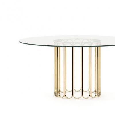 底座是用麥芽色的緞面金屬或拋光鋼制成的——后者顯然受到了上世紀(jì)70年代的啟發(fā)——可以與大理石和木質(zhì)頂部搭配。?也可用在底部Moka-coloured雞翅木木材涂裝只有當(dāng)結(jié)合在古銅色的玻璃頂部。?