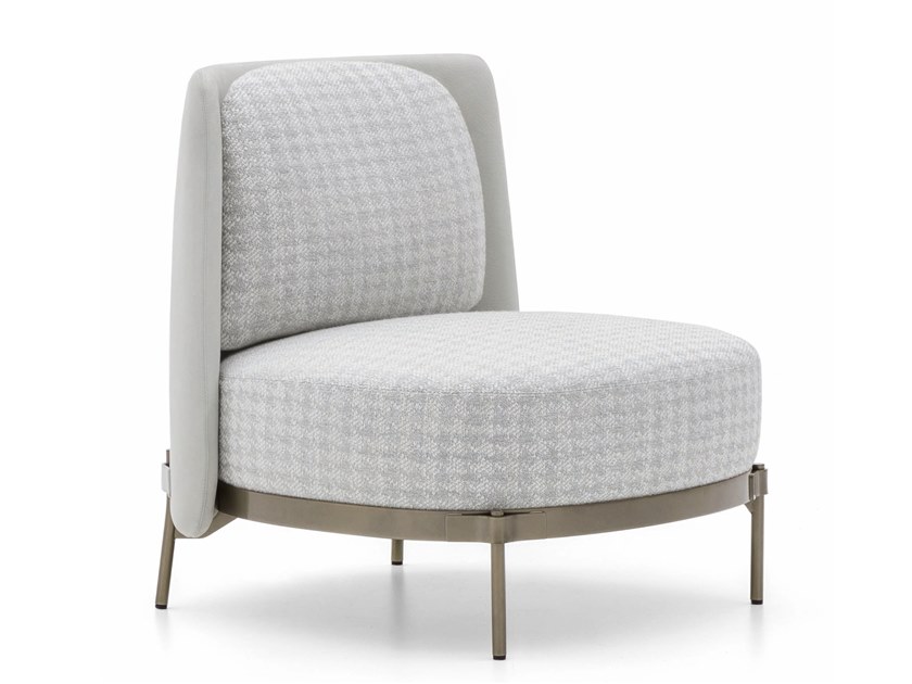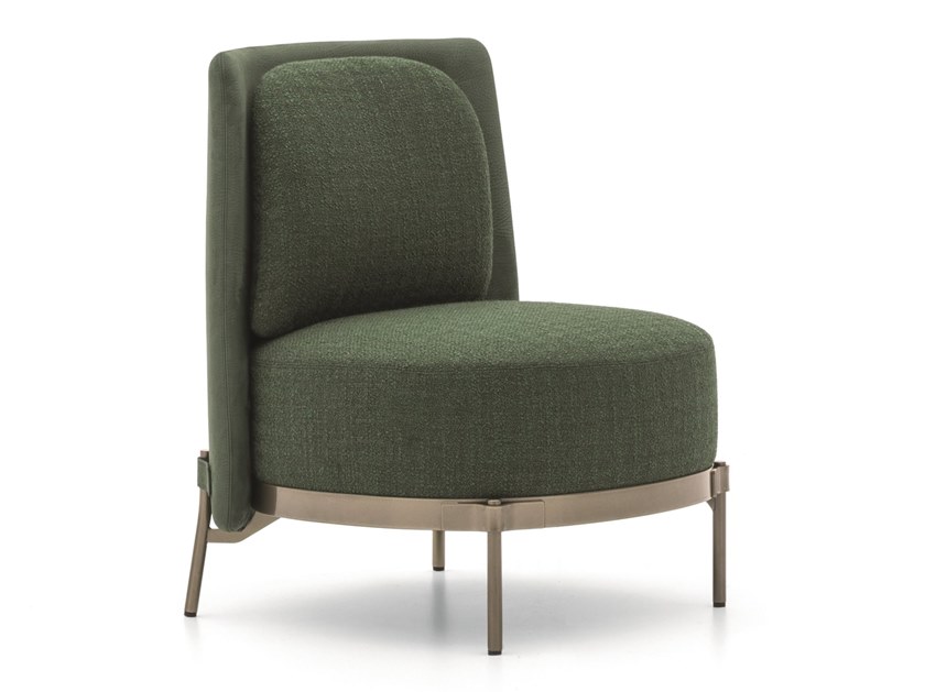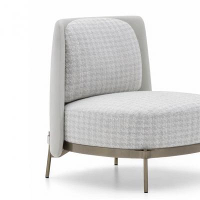Customizable in a wide range of leather and fabric coverings, it presents two possible sets of pairings.? In one version, the fabric covers the back and the seat cushion, while the shell and the tape detail are in leather of the same colour; in the other, the textile envelops the back, the seat cushion and the entire shell, while the tape detail is in Light Bronze-coloured saddle-hide.?