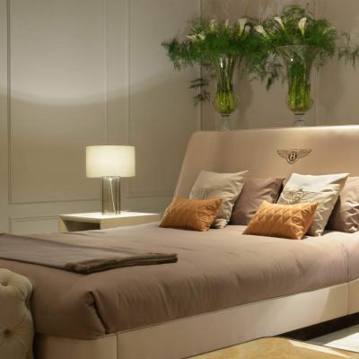 The Richmond bed exemplifies the supple elements and stylistic principles characteristic of the line. Unrivalled comfort is created by its roomy design in which the masterfully crafted materials play a prime role. The unique and elegant double shell – covered in quilted leather or precious briar root – encompasses the headboard lined with iridescent sand-coloured satin wool. The finish is enhanced by the finely embroidered Bentley logo.