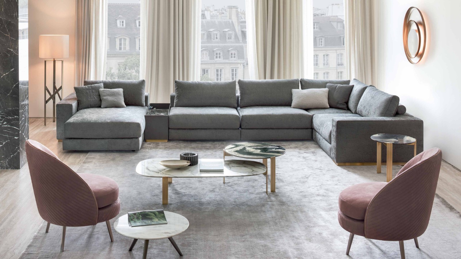 A range of upholstered furniture characterised by a brushed brass detail on the armrests and a serie of harmoniously-disposed pliss on the backrest.沙發(fā)一系列的軟墊家具,特點(diǎn)是扶手上有一個(gè)拉絲的黃銅細(xì)節(jié),靠背上有一系列處理和諧的pliss。