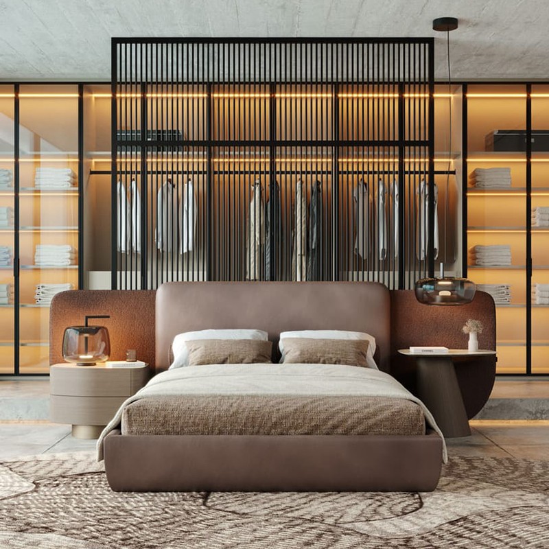 帶抽屜的長方形木制床頭柜。黃褐色臥室以其精致的線條和豪華的設(shè)計細節(jié)而聞名,其材料和顏色組合營造出一種精致的氛圍。通過根據(jù)特定需求量身定制的互補件為空間增添了特色。