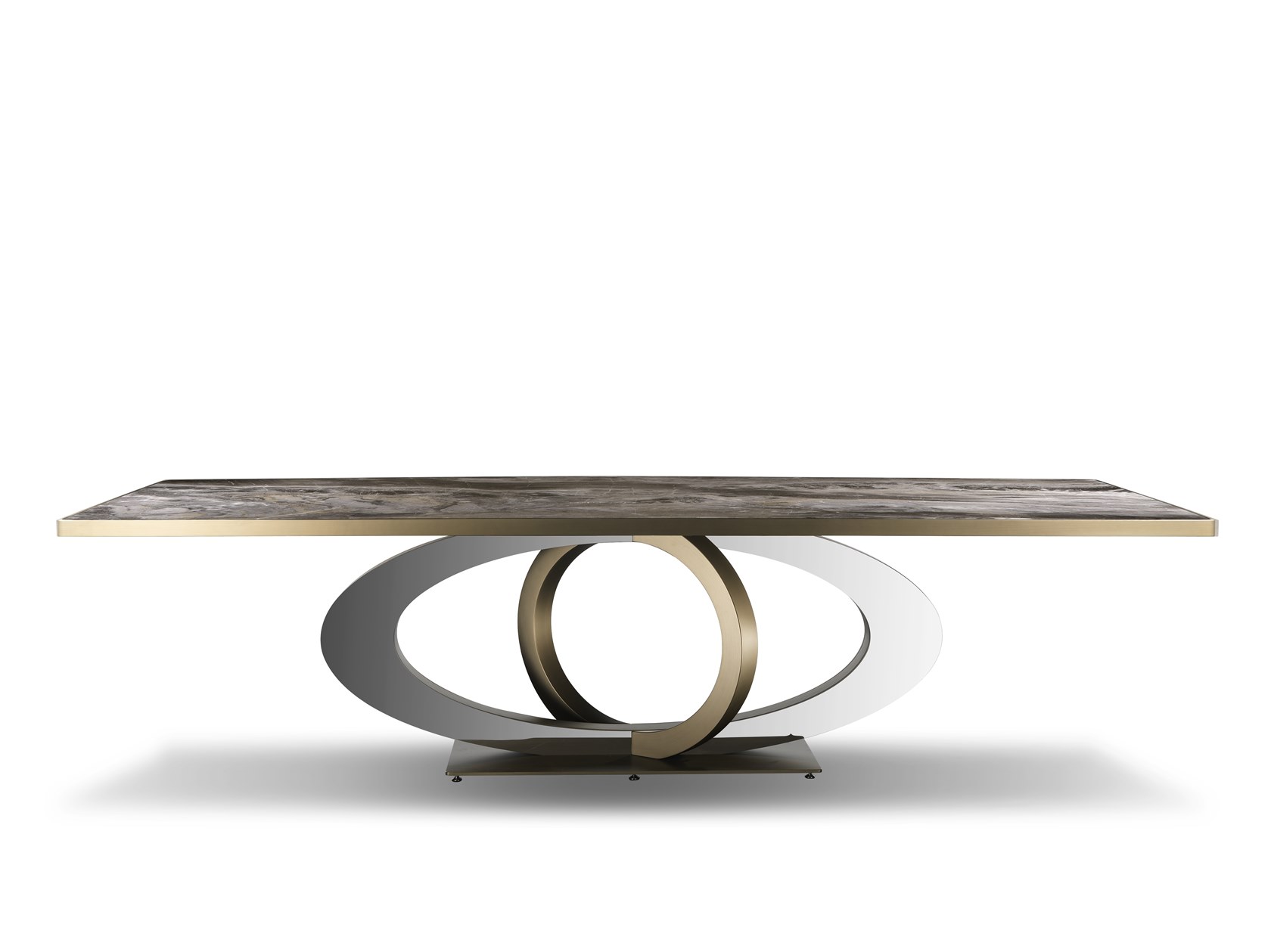 餐桌,底座和底座采用緞面黃銅(104M)或深黃銅(105M)制成。細節(jié)采用閃亮鋼。圓形或矩形木制臺面采用40 mm厚的邊緣,玻璃鑲嵌在漆面或蝕刻漆面玻璃或大理石玻璃中