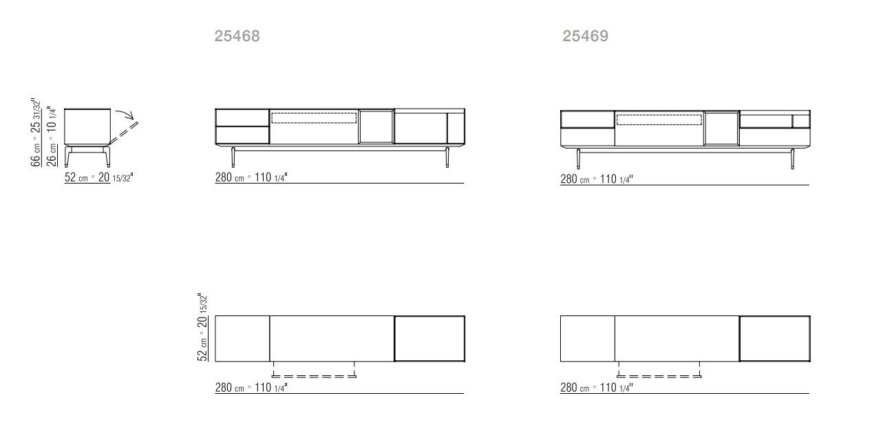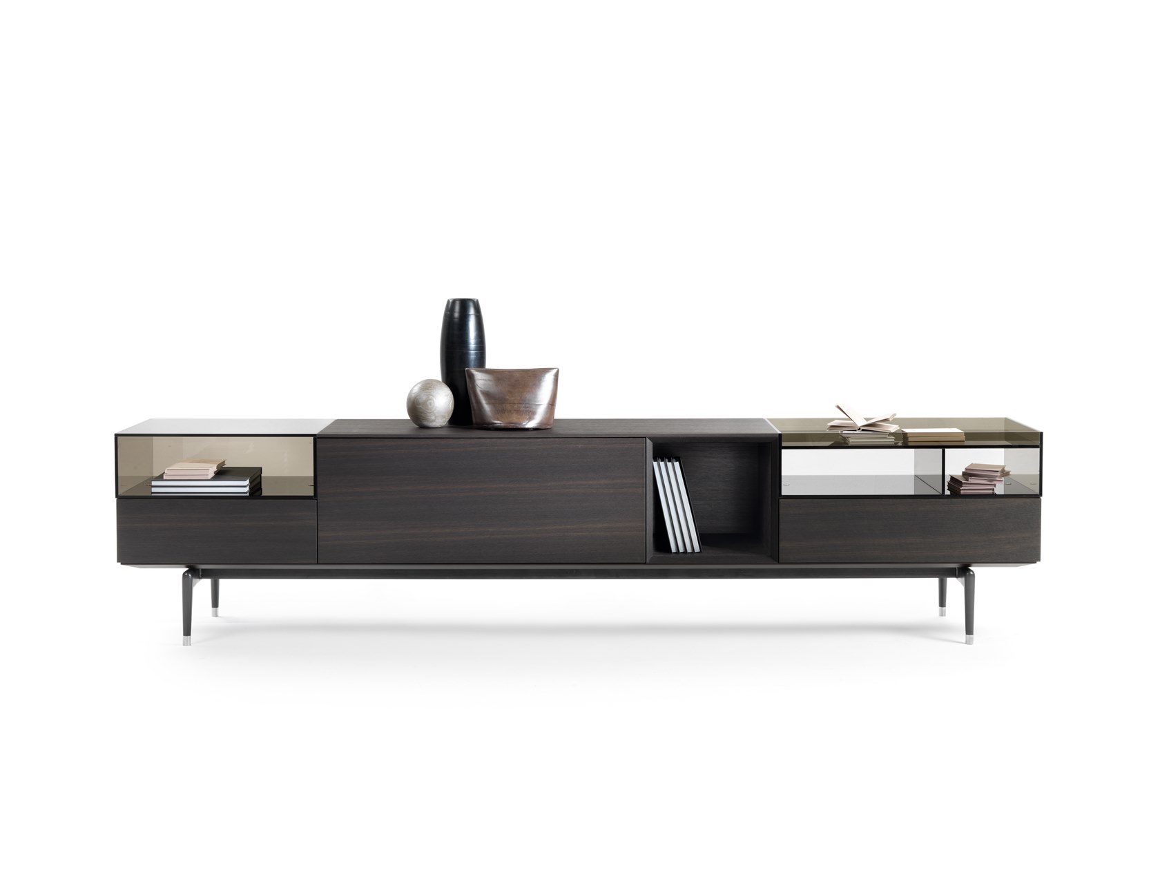 Modules in heat-treated oak veneer or in wood with glossy lacquer finish in white, black, dove grey.? Modules also available in glass or in glass with wood drawers coordinated with the 140 cm element