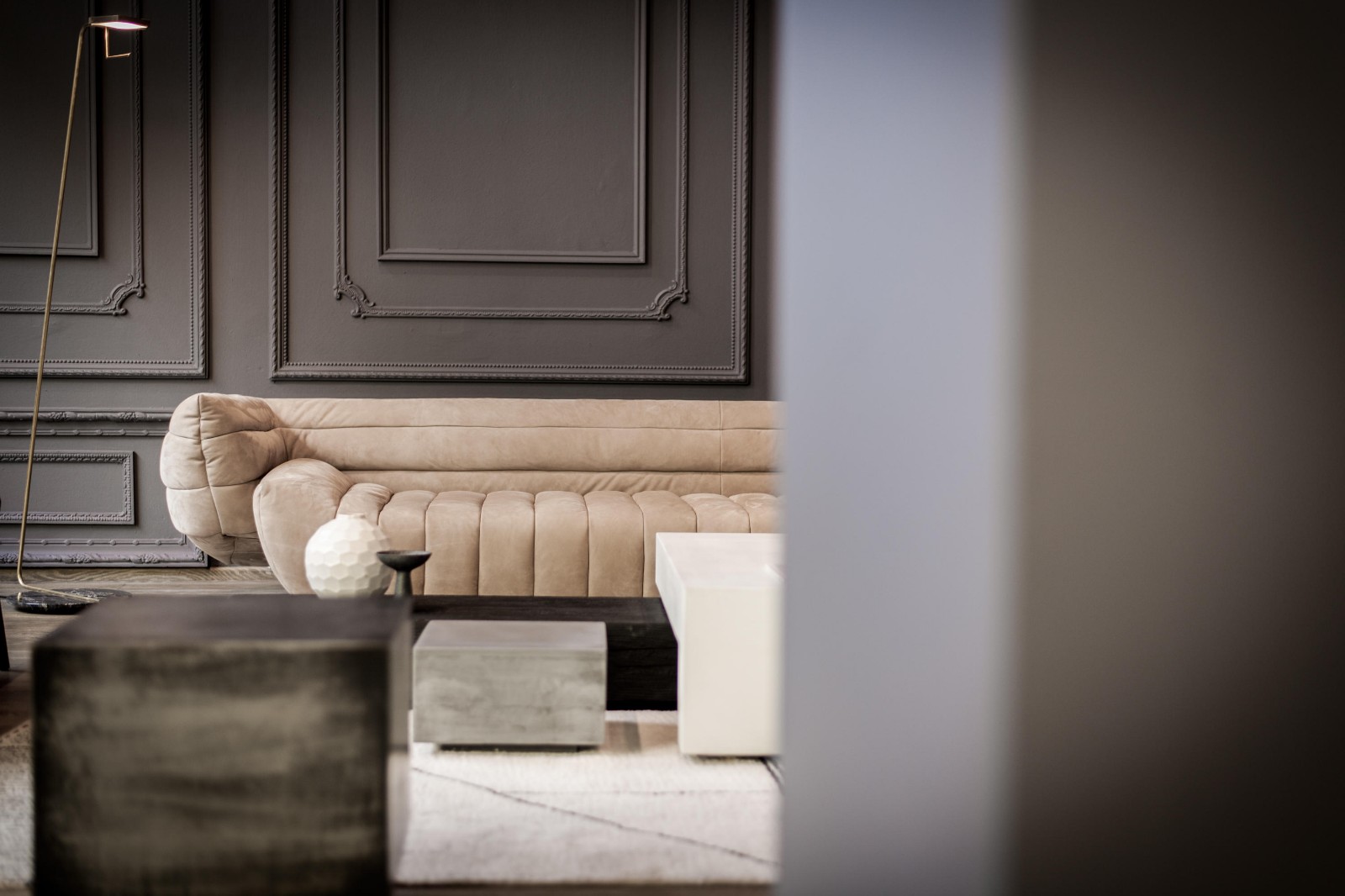 通過其柔軟和擁抱的形狀,觸覺沙發(fā)想要增強皮革的觸感,同時,發(fā)展對細節(jié)的關(guān)注。這個沙發(fā)被分解成基本的部分。座椅和靠背彼此獨立,不同的絎縫強調(diào)了這兩個元素之間的區(qū)別,只有在對其穩(wěn)定性有必要的地方才會有輕微的接觸。