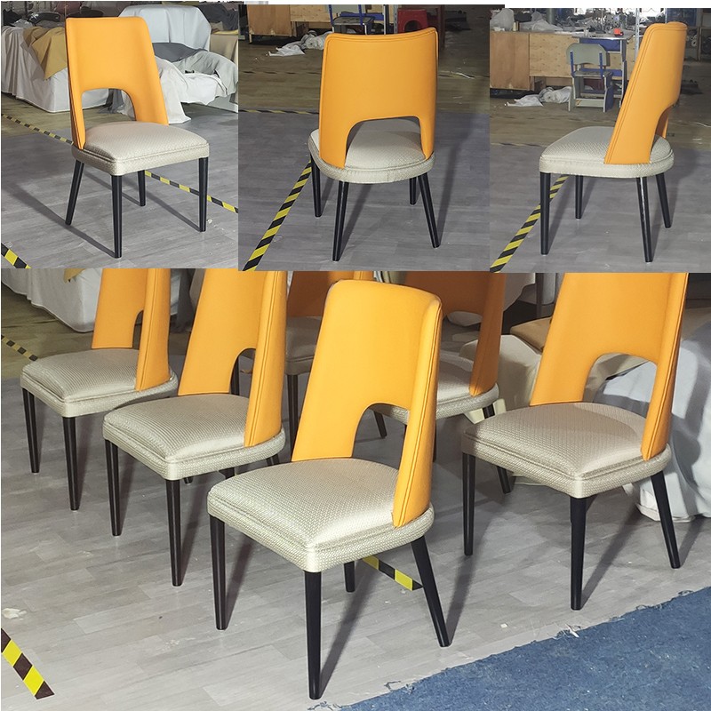 餐椅,軟墊,外背板是絎縫工藝絨面革,金屬飾面,腿上漆,金屬帽。