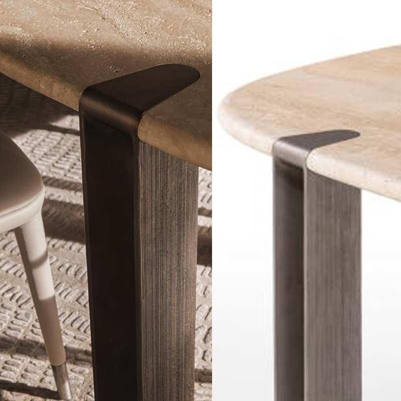 奢華和堅固,增強了木制結(jié)構(gòu)與頂部和腿上的金屬。樸素美學(xué)被金屬飾面的珍貴所軟化,這是一張巨大而精致的桌子。金屬拋光色支腿和頂部嵌件