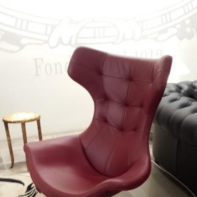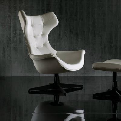 ultra-contemporary interpretation of the classic bergère, Regina II is a swivel armchair. The seat and the backrest are upholstered in Pelle Frau? leather. The capitonné effect workmanship enlivens the surface, creating a delicate play of spaces and solids. The padding is in polyurethane foam and Dacron? and the base is in painted steel. Regina II comes with an elegant pouf.