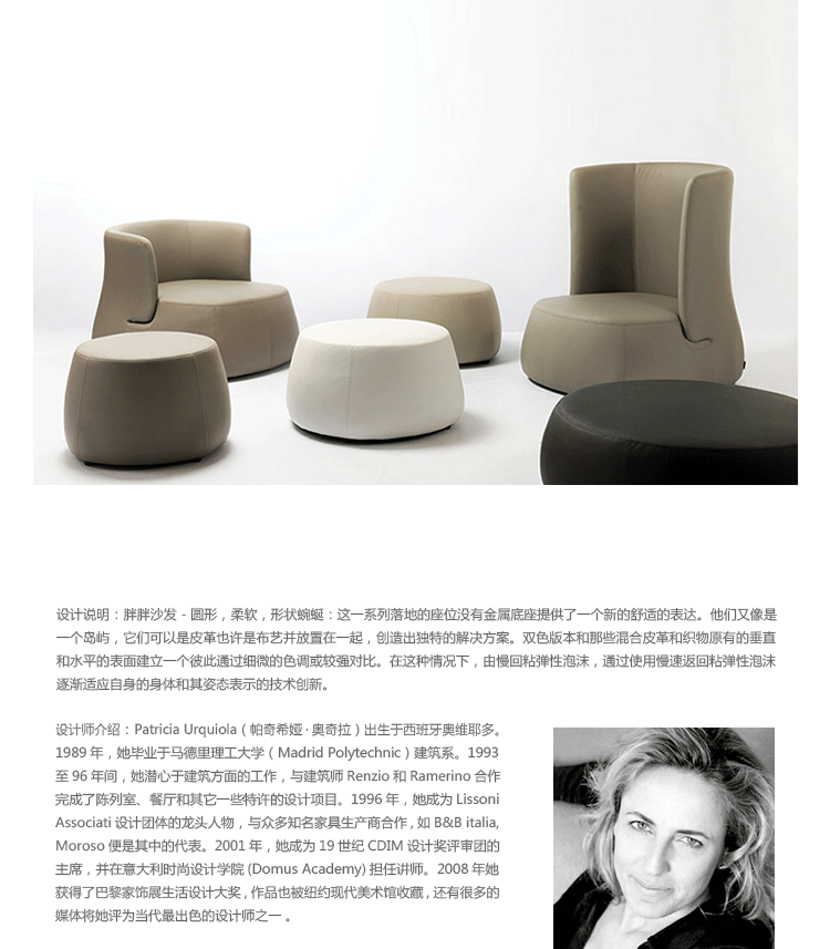 是由知名設(shè)計師 Patricia Urquiola(帕奇希婭·奧奇拉)設(shè)計的,她曾與眾多知名家具商合作過,如B&B italia,Moroso。。。她獲得的巴黎家飾展生活設(shè)計大獎被紐約美術(shù)館收藏,并且媒體將她評為當(dāng)代最出色的設(shè)計師之一。